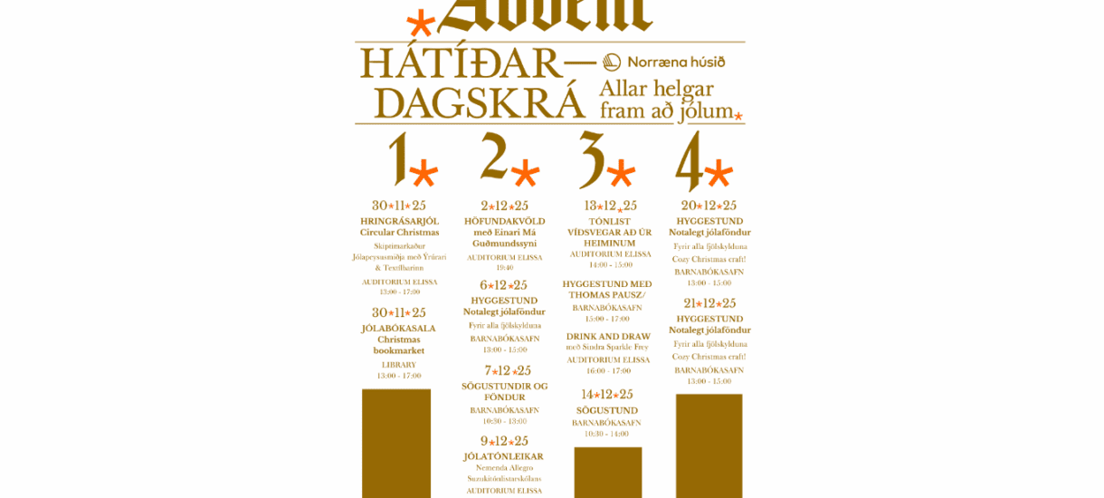 Verið hjartanlega velkomin að njóta aðventunnar með okkur i Norræna húsinu. Hátiðardagskráin okkar leggur áherslu á samveru og ljúfar stundir.