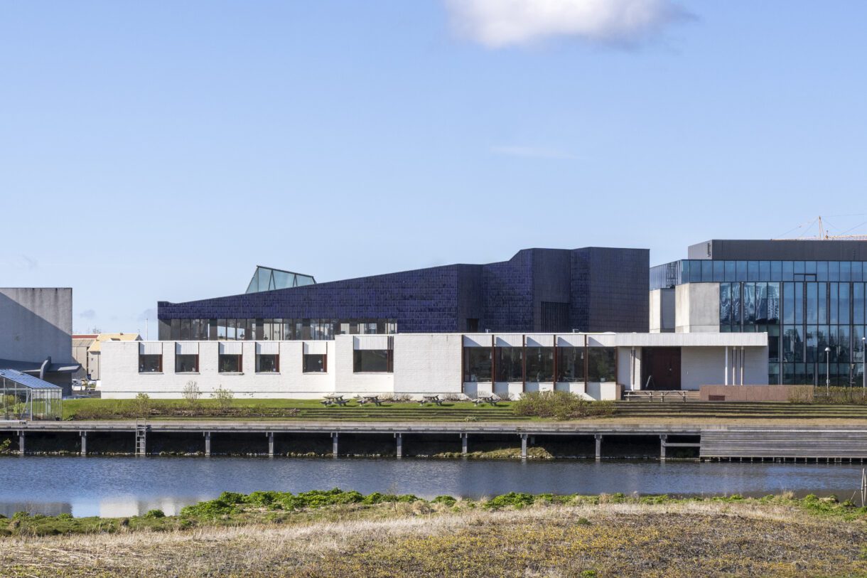 Norræna húsið með flögg Norrænu landana og Norrænu ráðherranefndarinnar.