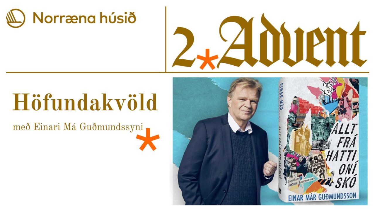 The event begins at 20:00, where Einar Már will speak freely inspired by his novel Allt frá hatti oní skó.