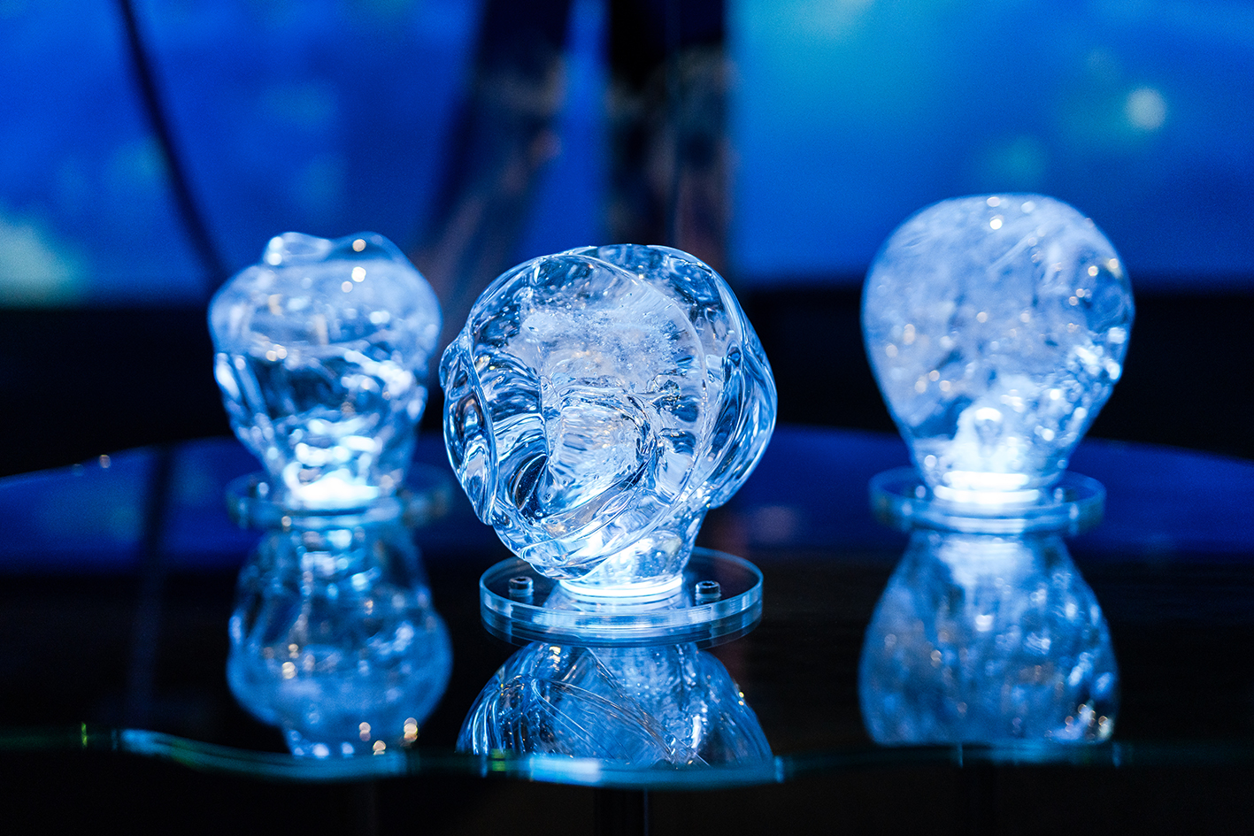 The light in the glass works changes in real time according to the water isotope values detected from water vapour in the glacier Vatnajökull. Subtle movements reveal formations of air trapped inside the glass as a result of the dynamic glassblowing process. The work highlights the invisible, rapidly changing yet meaningful moments that are constantly occurring in the areas that are warming faster than the rest of the Earth.